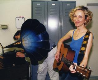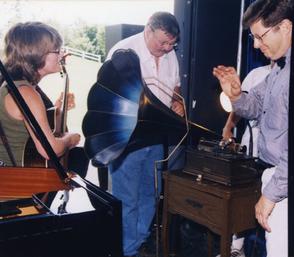 Above: First and second photos respectively: Terre Roche and Jenny Bruce record into Edison's phonograph. Third photo: Groovelily band- electric violinist and singer Valerie Vigoda, pianist Brendan Milburn, and drummer Gene Lewin.
